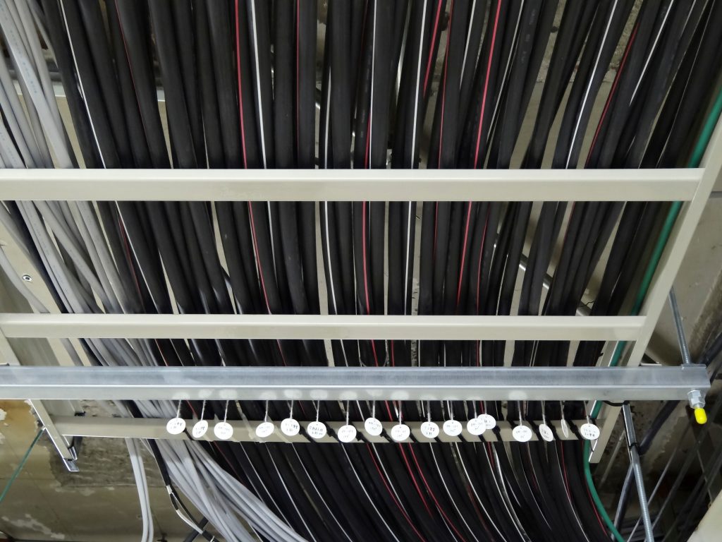 幹線設備工事とは引き入れた電気を照明、空調機、ポンプ類等の機器に供給するための工事を指します。変圧器、配電盤を経由して各電灯分電盤、動力制御盤に至る配電経路を構築します。幹線の交換・増設・撤去工事から地中埋設工事、架空配線工事、ケーブルラックの設置・ルート変更、分電盤の増設・移設・撤去工事など、多岐にわたります。機器に合わせた配線の選定だけでなく、作業員の作業領域などを考慮し、最適なルートをご提案します。